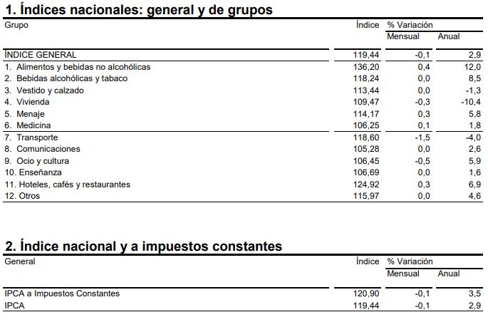 - El Índice de Precios de Consumo Armonizado (IPCA) sitúa su tasa anual en el 2,9%, nueve décimas inferior a la del mes anterior.