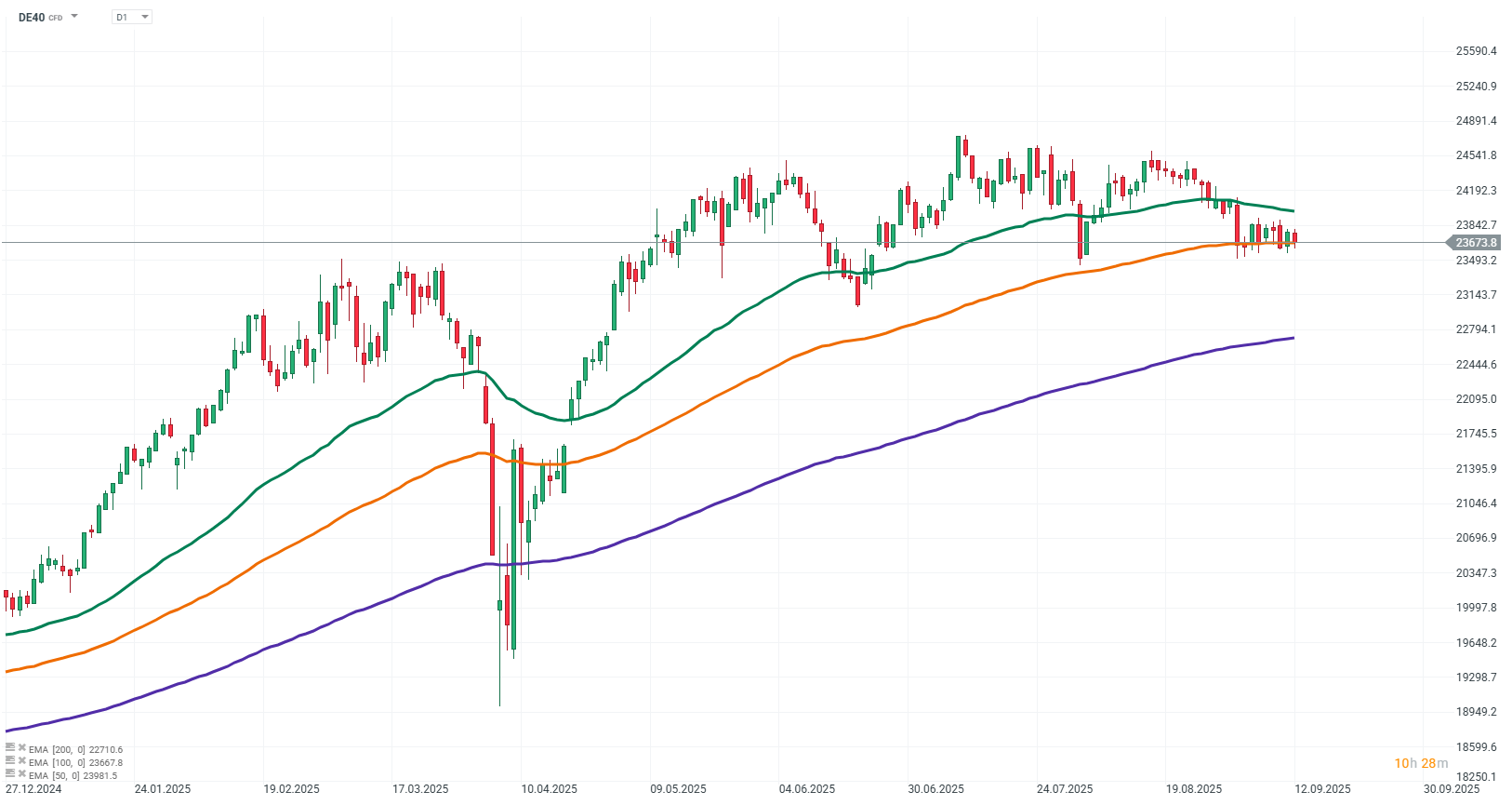 El DAX 40 cae un 0,4% en la sesión de hoy y cotiza muy cerca de un nivel de soporte definido por la media móvil exponencial de 100 días (curva naranja en el gráfico). Esta zona actúa como soporte técnico, ayudando a contener mayores caídas. Sin embargo, el sentimiento de mercado se mantiene cauteloso, ya que la próxima decisión de la Reserva Federal, prevista para la próxima semana, podría tener un impacto significativo en el sentimiento global, incluyendo los índices europeos.