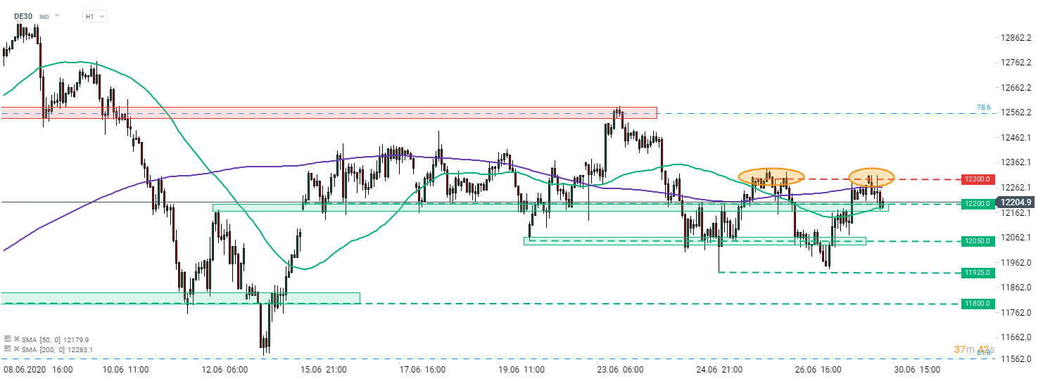 DE30 hizo un descanso por encima del promedio móvil de 200 horas (línea púrpura) durante la noche, pero no logró permanecer allí por mucho tiempo. Un fuerte movimiento descendente comenzó después del lanzamiento de la sesión europea de efectivo. DAX está tratando de detener un movimiento descendente en la zona de soporte que oscila por debajo de 12,200 pts y un promedio móvil de 50 horas, que se ejecuta en la misma área (línea verde). Sin embargo, los operadores deben tener en cuenta que se pintó un doble techo en el área de 12,300 pts (círculos naranjas), por lo tanto, podría haber una desventaja adicional en las tarjetas. Sin embargo, en caso de que se mantenga el soporte a 12,200 pts, la atención se desplazará hacia el promedio móvil de 200 horas y el área de 12,300 pts como la resistencia más cercana. Se espera que Powell testifique ante el Comité de la Cámara (5:30 pm BST), pero como el texto ya fue publicado, el evento puede no tener un gran impacto en los mercados bursátiles.