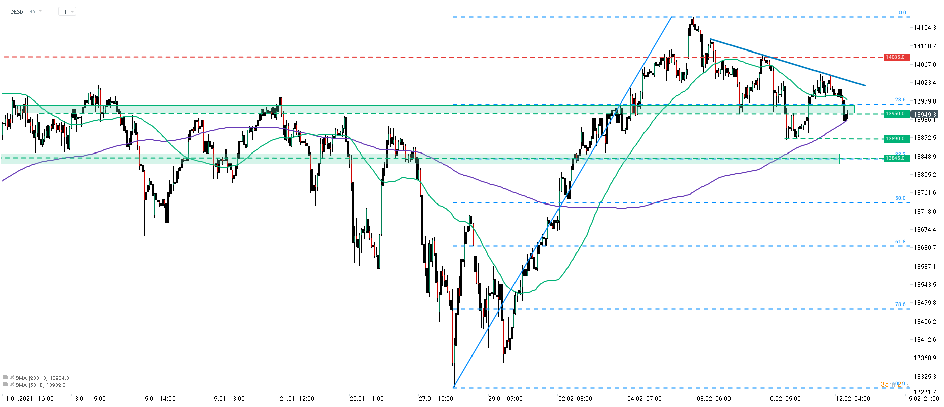 DE30 ha caído por debajo de la zona de precios que oscila entre 13,950 pts y un retroceso del 23,6%. La caída se ha detenido en el promedio móvil de 200 horas (línea púrpura) y ahora el índice intenta volver a subir por encima del nivel de 13,950 pts mencionado anteriormente. Un punto a tener en cuenta es que el DE30 no logró pintar un mínimo más bajo, por lo que es posible que se avecina un cambio en el corto plazo. Sin embargo, para hablar de una reversión, el índice no solo tendría que volver a romper por encima de los 13,950 pts, sino también por encima de la línea de tendencia descendente a corto plazo (área de 14,025 pts actualmente). Por otro lado, en caso de que el índice reanude su movimiento a la baja y se rompa por debajo del promedio móvil de 200 horas, los primeros niveles de soporte a observar se pueden encontrar en 13,890 y 13,845 pts.