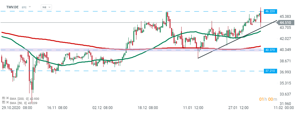 Las acciones de TeamViewer (TMV.DE) no se mantuvieron por encima de la resistencia en 46,22 € y los vendedores empujaron rápidamente el precio hacia la línea de tendencia alcista. Si se produce una ruptura por debajo de la línea de tendencia, el movimiento a la baja puede acelerarse. El siguiente soporte a vigilar se sitúa en 40,37 €. Fuente: xStation5