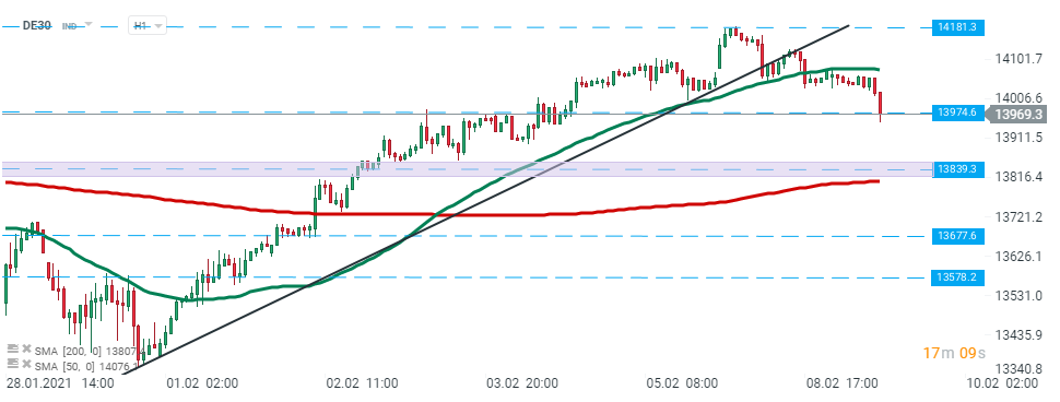 El DE30 se lanzó una semana al alza , sin embargo, después de registrar un nuevo máximo de ATH, comenzó la corrección a la baja. El índice rompió por debajo de la media móvil simple de 50 (línea verde) y actualmente está probando el soporte local en 13,974 pts. Si se produce una ruptura por debajo, el movimiento a la baja hacia los 13,839 pts puede acelerarse. Por otro lado, si los compradores logran detener las caídas aquí, entonces podría lanzarse otro impulso alcista hacia el nivel de 14.181 pts. Fuente: xStation5