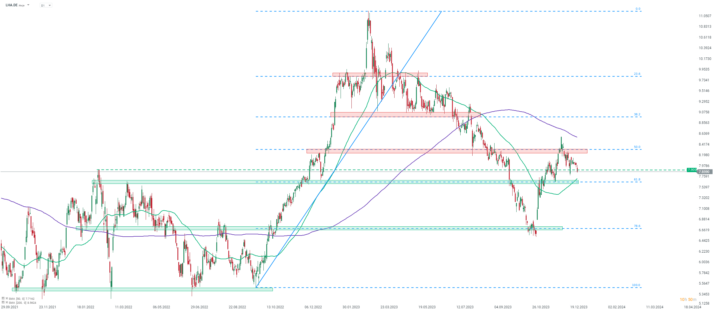 Lufthansa (LHA.DE) cae tras la rebaja de Citi. Las acciones están rompiendo hoy por debajo de la zona de 7,90 euros. El precio continúa retrocediendo tras no poder superar el retroceso del 50% del movimiento alcista lanzado a finales de septiembre de 2022 a principios de diciembre. El siguiente nivel a observar si la caida continúa se puede encontrar en el retroceso del 61,8% en la zona de 7,65 euros. Fuente: xStation5