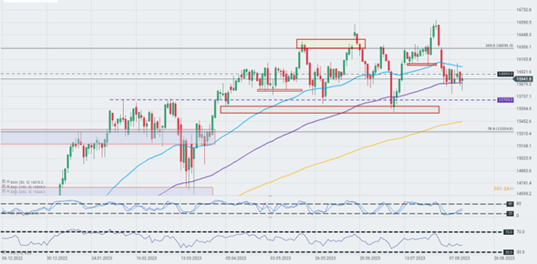 El DAX alemán continua cotizando en un rango estrecho delimitado por el promedio móvil exponencial de 50 días (curva azul) y el promedio móvil exponencial de 100 días (curva púrpura). Fuente: xStation 5
