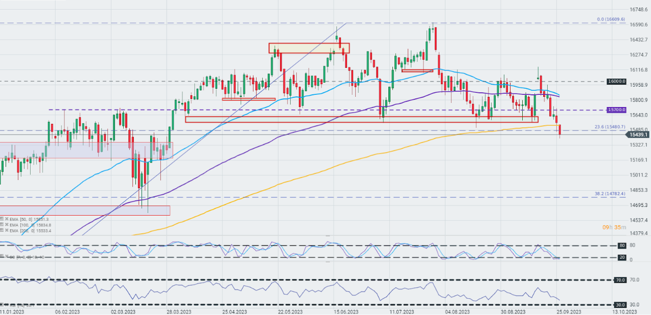 Los futuros alemanes basados en el DAX alemán están perdiendo casi un 0,82% intradía y rompiendo por debajo de la zona de soporte establecida por la media móvil exponencial de 200 días (curva del oro). Fuente: xStation 5