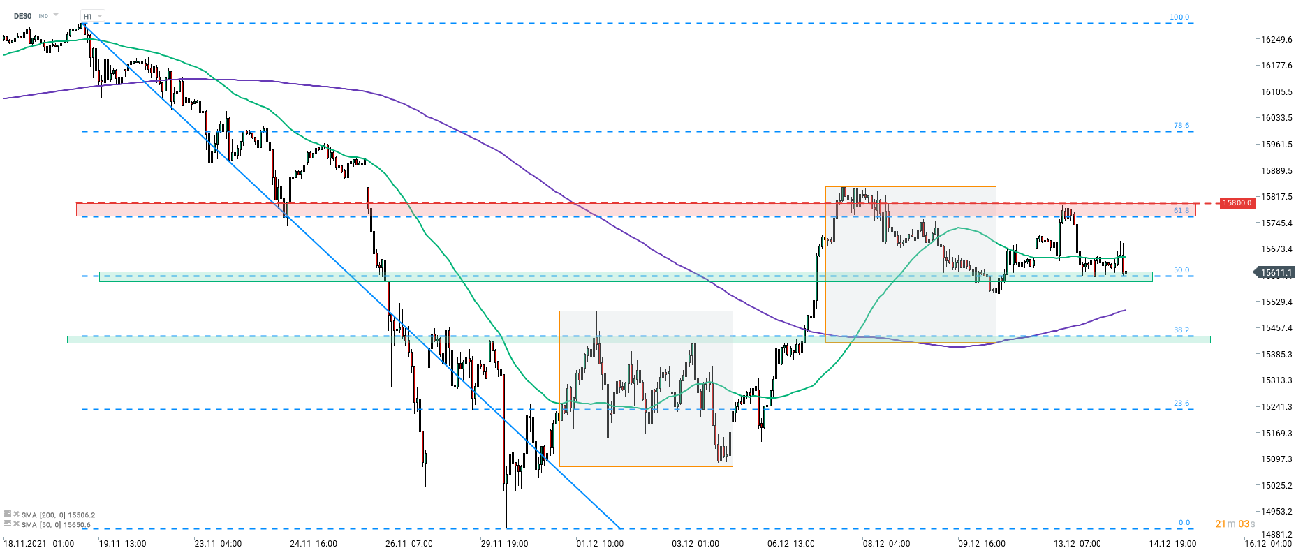 Los índices europeos cedieron a las subidas iniciales. La mayoría de los índices de primera línea del Viejo Continente cotizan poco en el día. Destaca el IBEX español (SPA35) que gana un 0,6%. El polaco WIG20 (W20) es el de peor rendimiento, cayendo un 0,5% en el momento de la publicación. Los mercados están algo nerviosos antes de la decisión final del FOMC de 2021 mañana a las 20:00h. El calendario económico de hoy carece de publicaciones importantes de datos.