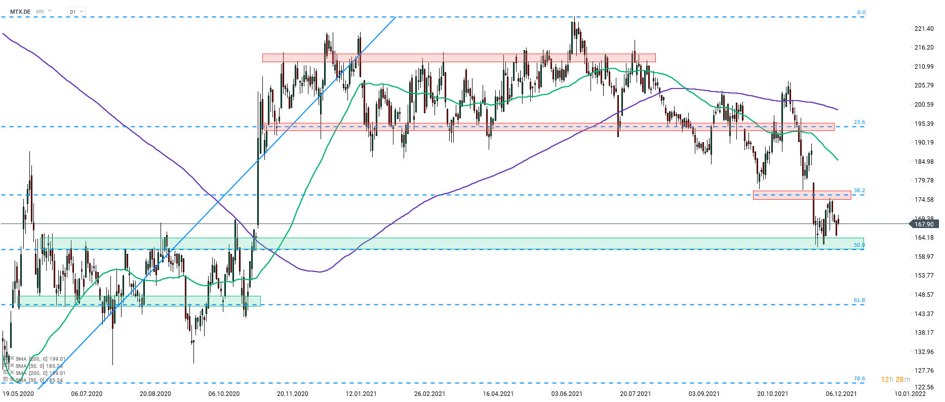Las acciones de MTU Aero (MTX.DE) se lanzaron hoy al alza tras una doble mejora de UBS y JPMorgan. Sin embargo, las subidas se borraron después de que los estados de ánimo del mercado comenzaran a deteriorarse. Las acciones ahora cotizan ligeramente a la baja en el día. Los niveles clave a tener en cuenta a corto plazo son la resistencia, marcada con un 38,2% de retroceso del movimiento de recuperación posterior a la pandemia, y el soporte en un 50% de retroceso. Fuente: xStation5