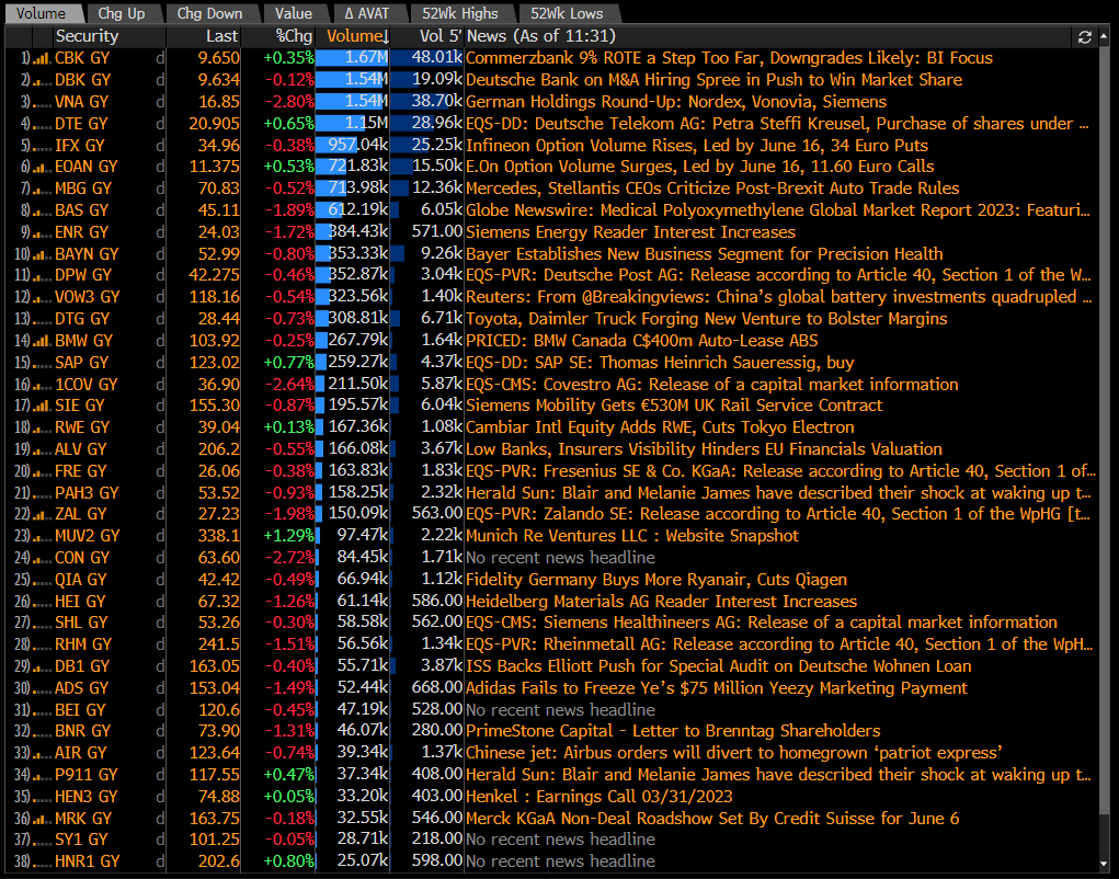 Principales cambios porcentuales y noticias de empresas individuales en el índice DAX. Fuente: Bloomberg