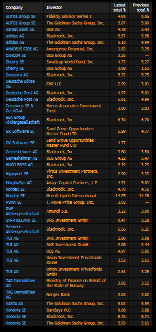 Cambios en las participaciones institucionales en empresas individuales del índice DAX (datos de la última sesión). Fuente: Bloomberg