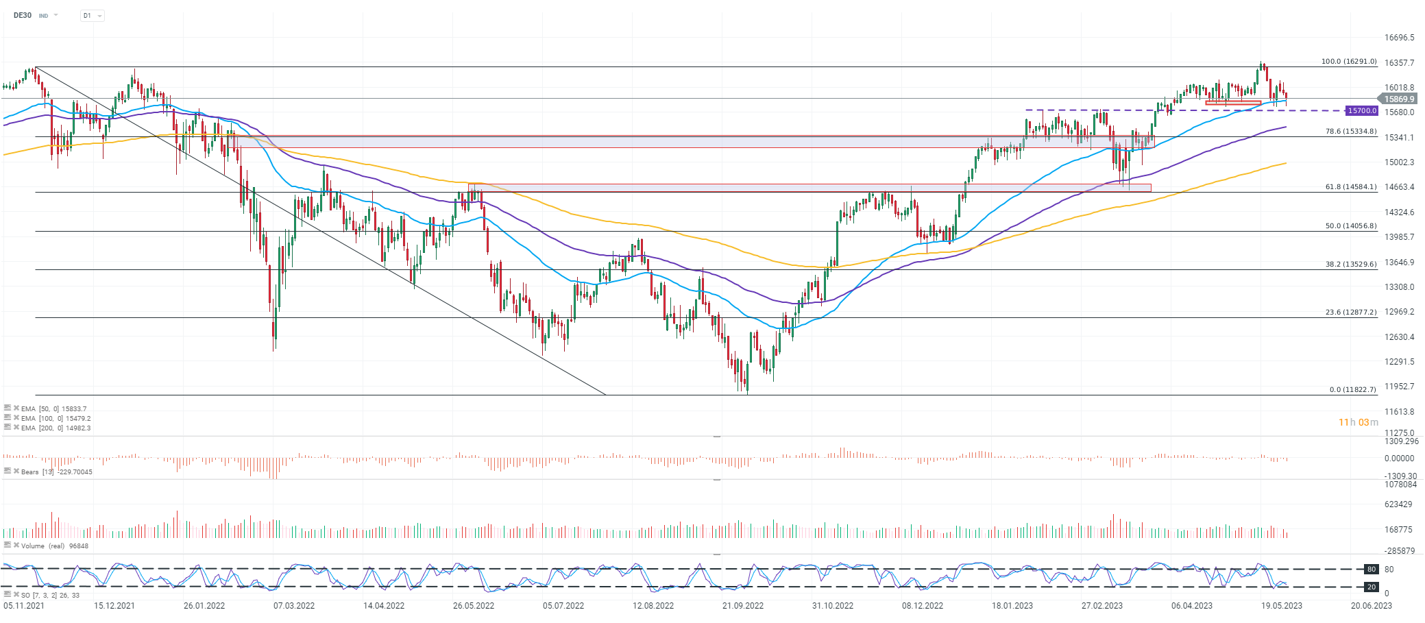 Los futuros basados en el índice alemán DAX (DE30) cotizan a la baja hoy, pero la escala de la caída se ha borrado en gran medida por el momento. Fuente: xStation 5