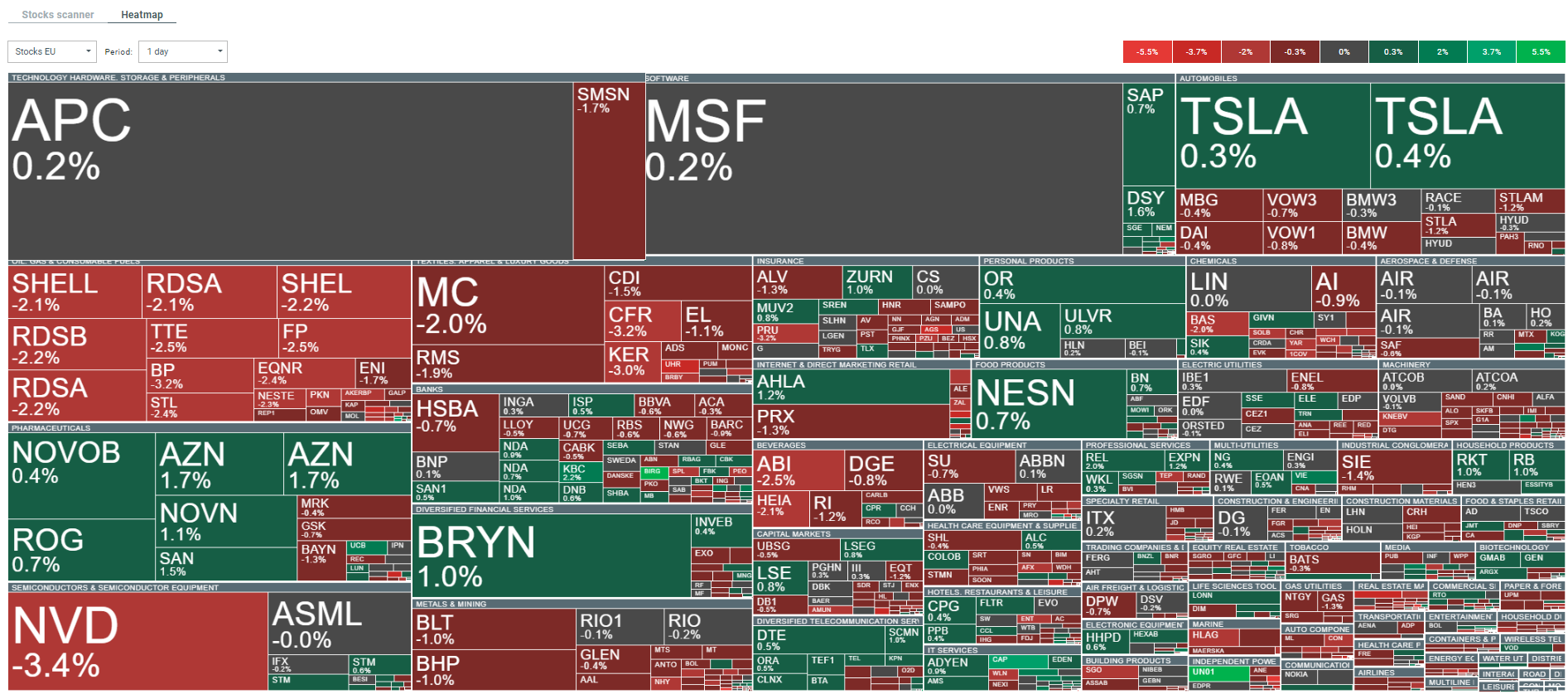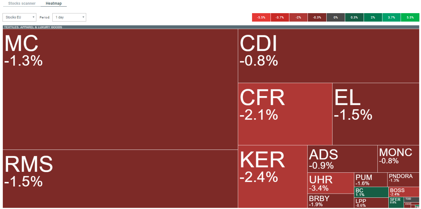 En Europa, el enfoque de la sesión de hoy está principalmente en los datos macro entrantes de China y la Eurozona, que tienen un impacto directo en el sentimiento débil en la industria de la moda. Los datos de China apuntaron a un debilitamiento de la economía. El PMI manufacturero cae a 48,8 puntos desde 49,2 puntos, incluso a pesar de las expectativas de un repunte a 49,4 puntos. El PMI de servicios, por otro lado, cae a 54,5 puntos desde 56,4 puntos ante las expectativas de una caída a 55,1 puntos. Como algo ilustrativo de la posición de los consumidores en China, estos datos han ejercido presión sobre empresas como LVMH (MC.FR), Kering (KER.FR) y Hermes (RMS.FR).