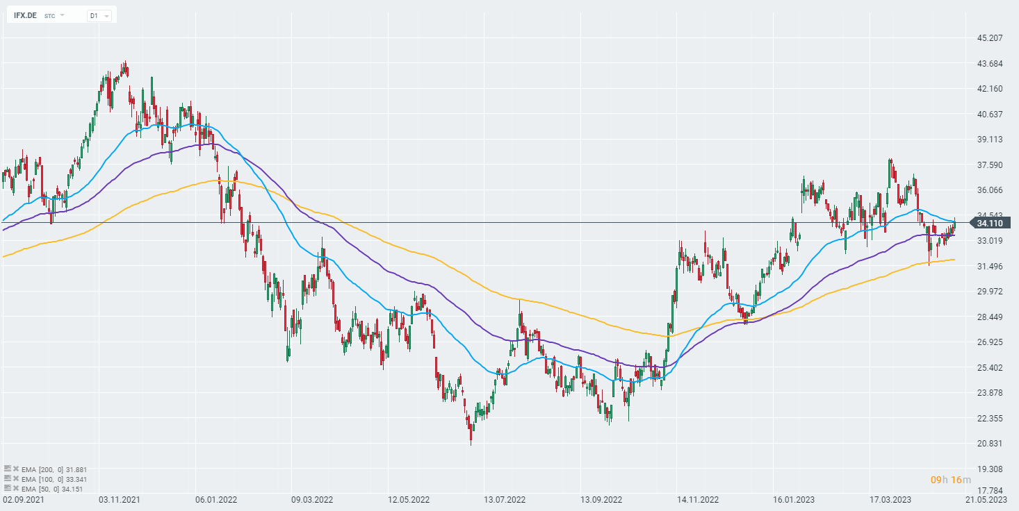 Las acciones de Infineon (IFX.DE) actualmente están probando la resistencia establecida por la media móvil exponencial de 50 días (curva azul). Fuente: xStation5.