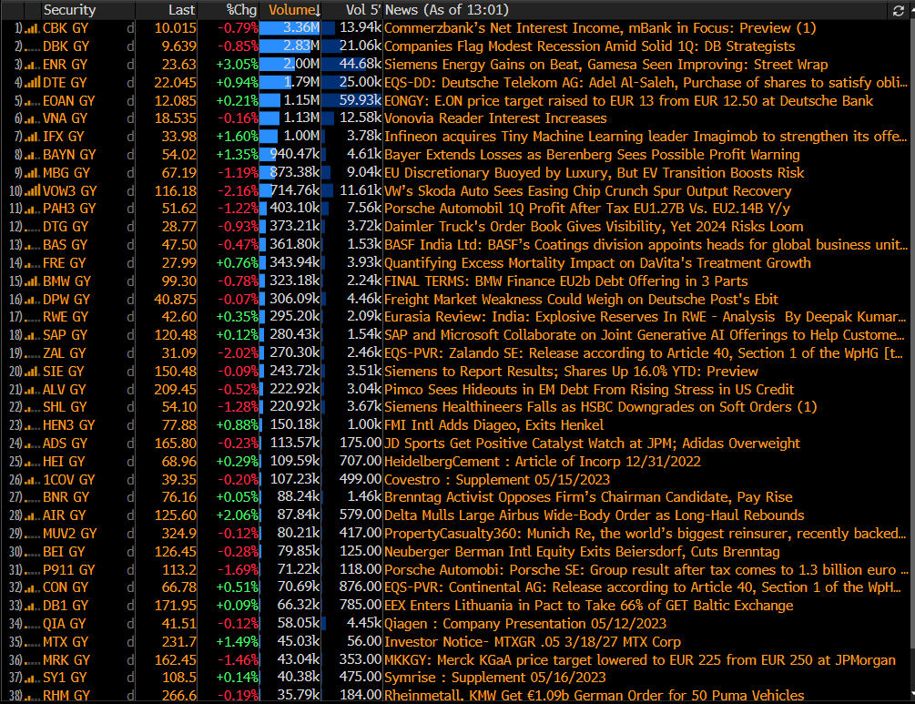 Principales cambios porcentuales y noticias de empresas individuales en el índice DAX. Fuente: Bloomberg.