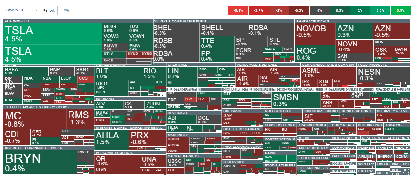 El sentimiento de los inversores en el Viejo Continente se está deteriorando ligeramente al comienzo de la semana. La mayoría de las empresas europeas están experimentando descensos moderados. Fuente: xStation 5