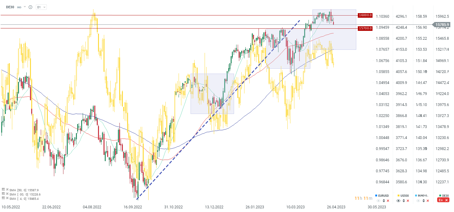 DE30 retrocede desde el área de los 16.000 pts y actualmente cotiza alrededor de un 3% por debajo de los máximos históricos por encima de los 16.300 pts. El primer soporte importante a observar se encuentra en la zona de los 15.700 pts, cerca de los mínimos locales de febrero y marzo. En caso de una ruptura a la baja, no se puede descartar un pullback hacia la zona de los 15.200 pts. El límite inferior de la estructura de Sobrebalance se encuentra en esta área. Fuente: xStation5
