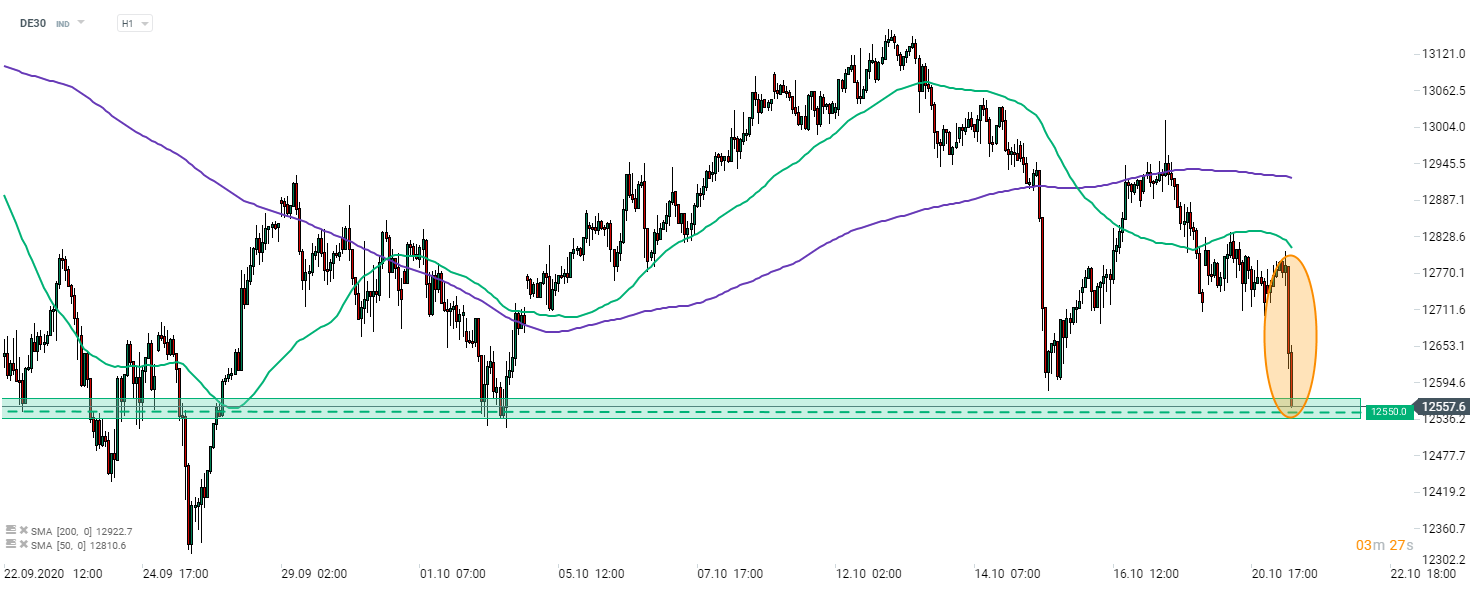 DE30 se desplomó al comienzo de la sesión de contado de hoy. El índice se acerca a mínimos mensuales en el área de 12,550 pts. Fuente: xStation5