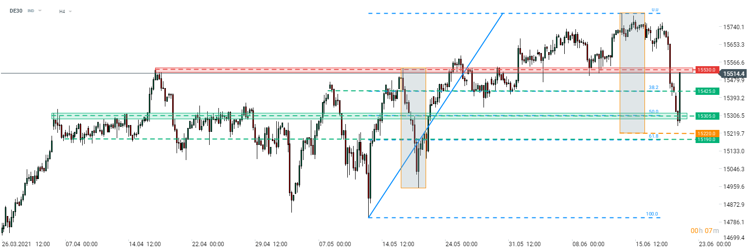 DE30 experimentó una liquidación masiva el viernes y el movimiento a la baja continuó durante el horario comercial asiático del lunes. Sin embargo, después de una apertura a la baja de la sesión de caja europea, el índice comenzó a recuperarse y ha rebotado alrededor de 200 puntos de los mínimos diarios. La liquidación se detuvo cerca de la zona de soporte marcada con un retroceso del 50% del movimiento alcista lanzado a mediados de mayo (área de 15.305 pts). El índice rompió por encima del retroceso del 38.2% en el área de 15,425 pts y se está acercando a la zona clave de resistencia a corto plazo en el área de 15,530 pts. Si bien el reciente movimiento a la baja parecía grande y empinado, los operadores deben tener en cuenta que ni siquiera fue la corrección más grande durante el impulso alcista de un mes en curso.