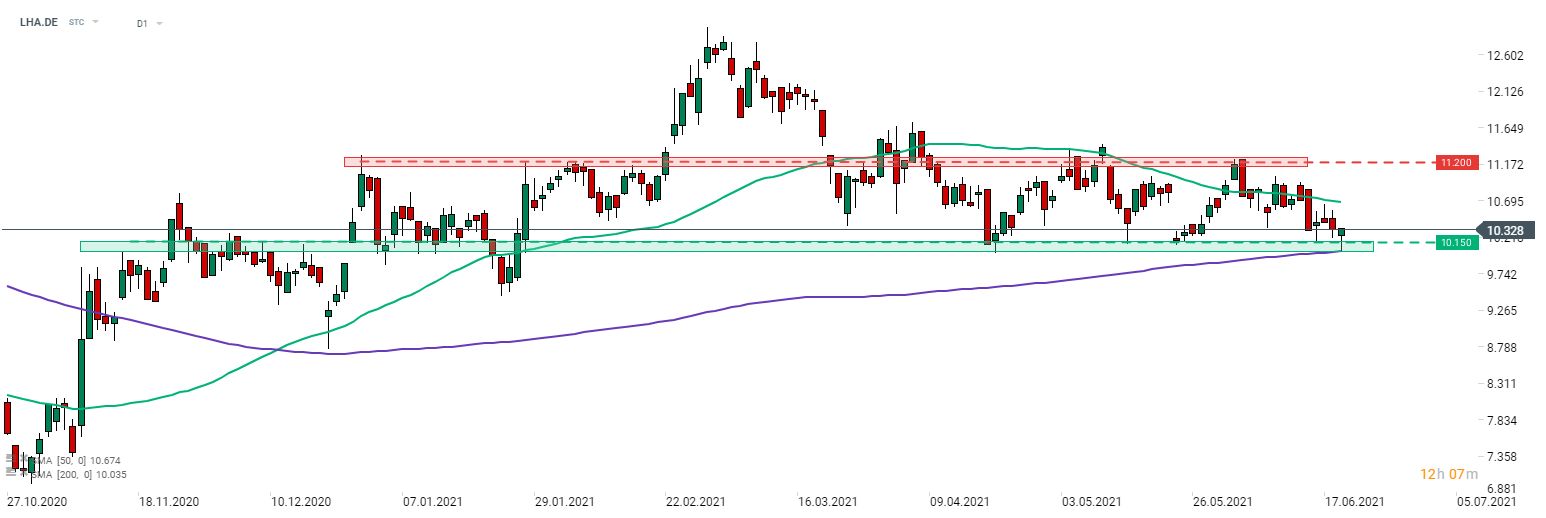 Lufthansa (LHA.DE) sufrió un golpe al comienzo de la negociación de hoy, junto con un mercado amplio. Sin embargo, al igual que sucedió con los principales índices bursátiles, Lufthansa comenzó a recuperarse más tarde. Desde un punto de vista técnico, la acción probó la zona de soporte que oscila entre la media móvil de 200 sesiones y el nivel de 10,15 €, y lanzó un movimiento de recuperación más adelante. La resistencia clave a corto plazo está marcada con el límite superior del rango de negociación en 11,20 €. Fuente: xStation5