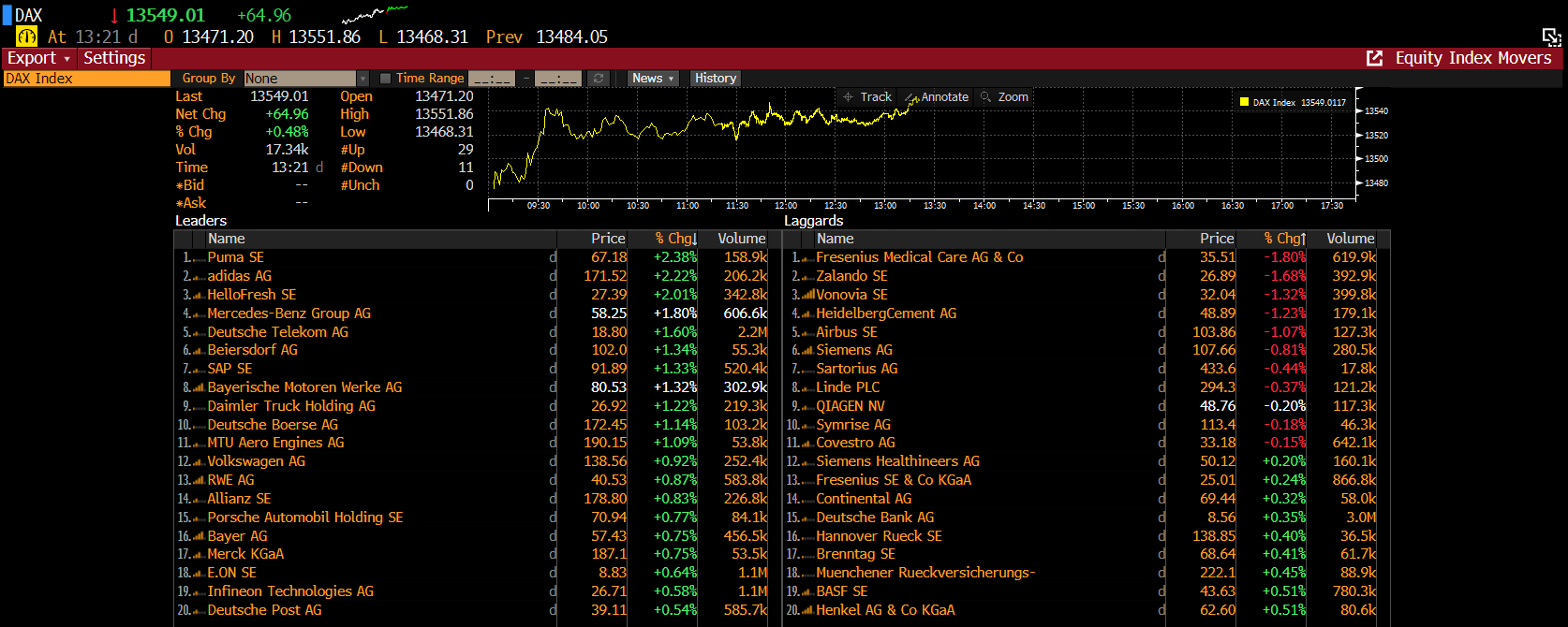Los mayores cambios porcentuales en las empresas incluidas en el índice DAX. Fuente: Bloomberg