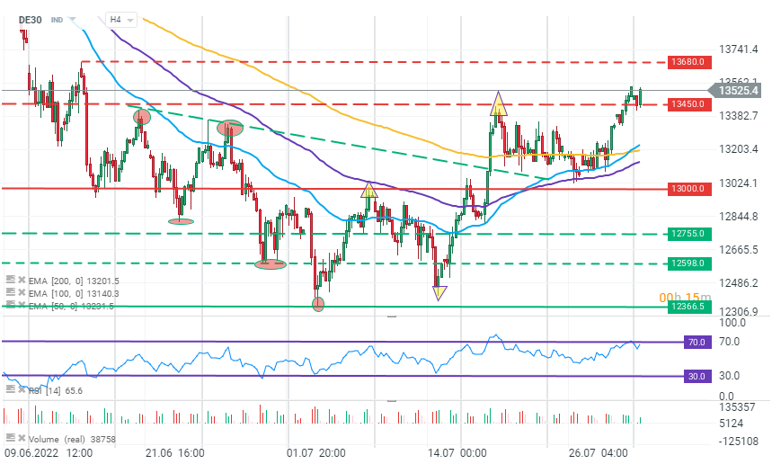 Gráfico de índice DE30, intervalo H4. El índice de referencia de primera clase está experimentando subidas hoy y ha superado el nivel de 13.450 puntos. Desde el punto de vista técnico, los soportes más cercanos son la barrera mencionada anteriormente de los 13.450 puntos y las medias móviles exponenciales (curvas azul, violeta y dorada). El nivel psicológico de 13.000 puntos también sigue siendo un punto importante. La resistencia más importante sigue siendo la zona de los 13.680 puntos. Fuente: xStaton 5