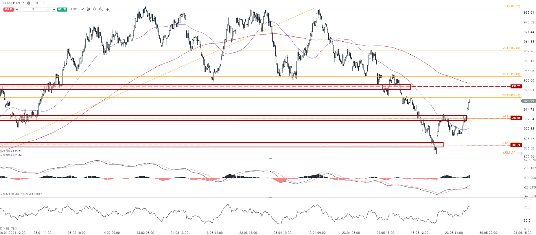 Actualmente, el precio está cotizando en 920, lo que se traduce en una apertura alcista que presenta una debilidad para el peso chileno, a pesar de haber disminuido el nivel de desempleo en un 0.2% hasta el 8.5% actual.