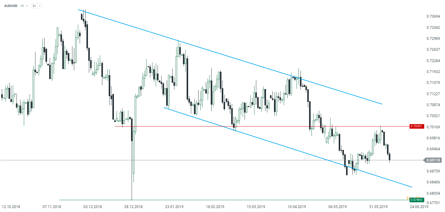 El AUDUSD continúa su marcha a la baja después de un intento fallido de romper por encima de 0.7020. El soporte más cercano podría encontrarse cerca del límite inferior del canal. Fuente: xStation5