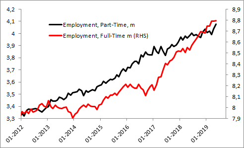 En mayo, la economía austriaca agregó 42.3k nuevos empleos que, a primera vista, parecen ser el número excelente. Sin embargo, casi todo el aumento provino de empleos de medio tiempo, ya que aumentaron hasta 39.8k, mientras que los empleos de tiempo completo aumentaron solo 2.4k. Se debe tener en cuenta que este fue otro mes consecutivo con dicha estructura en el empleo. En abril, el empleo general aumentó 43.1k, pero todo el aumento se debió a empleos de medio tiempo. Una pequeña decepción vino también de la tasa de desempleo que se mantuvo sin cambios en 5.2%, perdiendo la estimación mediana de una caída de 5.1%. Por otro lado, la tasa de participación en la fuerza laboral aumentó hasta un 66% desde un 65.9% revisado al alza en abril, lo que significa que la tasa alcanzó su máximo histórico. ¿Qué significa para la política monetaria allí? Los participantes del mercado están casi seguros de que el Banco de la Reserva de Australia apretará el gatillo una vez más en agosto y asignará más del 80% de probabilidades para tal escenario. Sin embargo, no hay duda de que los mercados tienden a reaccionar de forma exagerada (observe los precios actuales en los EE. UU.) Y dados los últimos comentarios del Gobernador de la RBA, Philip Lowe, dudamos que la RBA querrá recortar las tasas mucho más (hay un recorte de tasas en la mesa). , sin embargo, dependerá de lo que haga la Reserva Federal en el futuro más cercano). Recordemos que, según Lowe, la flexibilización de la política monetaria no es el camino ideal para impulsar la contratación y la inversión, por lo que el gobierno también debería emprender algunas reformas estructurales.