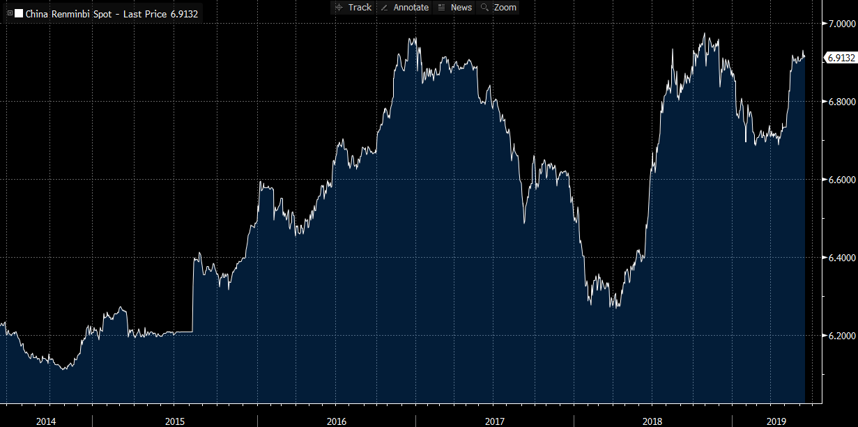 El yuan cayó fuertemente contra el dólar estadounidense en mayo debido a una nueva escalada de la guerra comercial. Fuente: Bloomberg