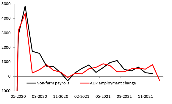 Las expectativas para el informe NFP de mañana son bastante débiles: apuntan a un aumento en el empleo al nivel de 150.000, frente a la publicación anterior igualmente débil de 199.000. Sin embargo, el estado de ánimo se deterioró significativamente después de la publicación del informe ADP, que mostró una disminución en el empleo al nivel de 301.000! Sin embargo, la caída en el empleo no debería ser una sorpresa, dado que Omikron ya tuvo un impacto en el mercado laboral en diciembre. ADP mostró que el sector del ocio y la hostelería registró la mayor caída en el empleo (154.000). El sector industrial también perdió mucho, con una caída en el empleo de 21.000. Casi todos los sectores mostraron una disminución del empleo. La excepción es el sector del petróleo y el gas, donde se agregaron 4.000 nuevos puestos de trabajo. Nuevos empleados. El informe ADP de ayer mostró el primer descenso desde diciembre de 2020 y el mayor descenso desde mediados de 2020.
