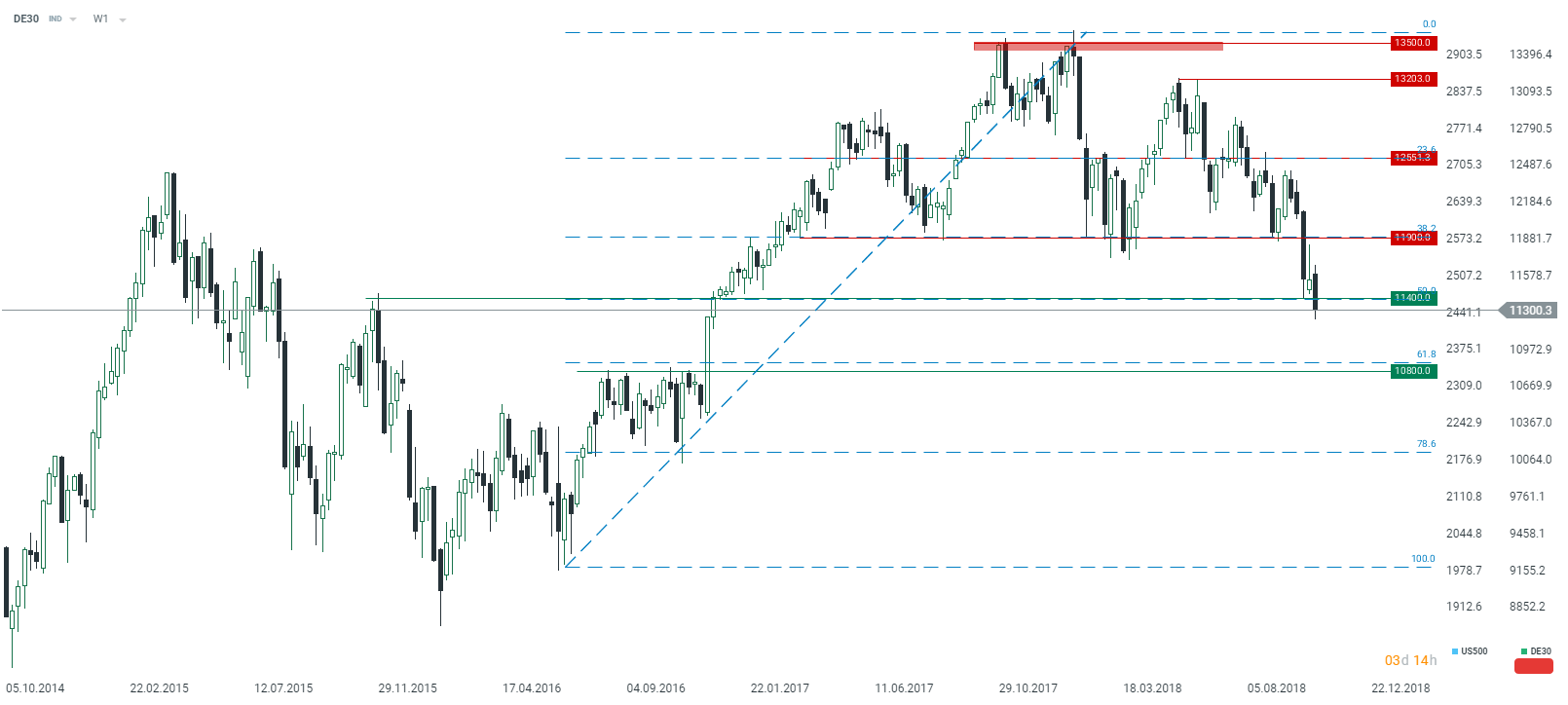 El DE30 alemán está negociando claramente por debajo de su nivel técnico crítico esta mañana después de los sombríos PMI. Desde un punto de vista técnico, el cierre de esta semana va a ser extraordinariamente importante, ya que puede establecer estados de ánimo para las próximas semanas. Desde nuestro punto de vista, el retroceso del 50% del rally desde mediados de 2016 podría ser el final simbólico del mercado alcista. Fuente: xStation5