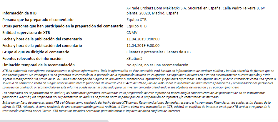 "Este informe se proporciona sólo con fines de información general y con fines educativos. Cualquier opinión, análisis, precio u otro contenido no constituyen asesoramiento de inversión o recomendación en entendimiento de la ley de Belice. El rendimiento en el pasado no indica necesariamente los resultados futuros, y cualquier persona que actúe sobre esta información lo hace bajo su propio riesgo. XTB no aceptará responsabilidad por ninguna pérdida o daño, incluida, sin limitación, cualquier pérdida de beneficio, que pueda surgir directa o indirectamente del uso o la confianza de dicha información. Los contratos por diferencias (""CFDs"") son productos con apalancamiento y acarrean un alto nivel de riesgo. Asegúrese de comprender los riesgos asociados. "