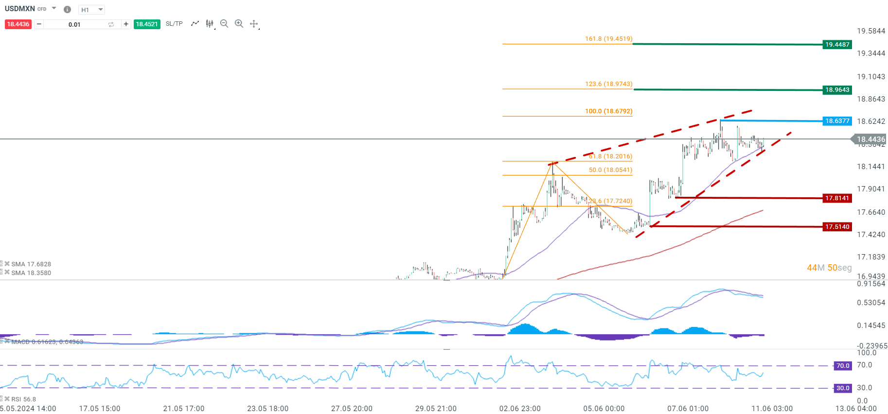 El precio del USDMXN se encuentra en un canal alcista, consolidándose cerca de los niveles superiores. El RSI se encuentra en 56.8, indicando que aún hay espacio para más movimientos al alza antes de llegar a niveles de sobrecompra. El MACD también muestra señales de continuación alcista, lo que respalda una posible ruptura por encima del nivel actual de resistencia.