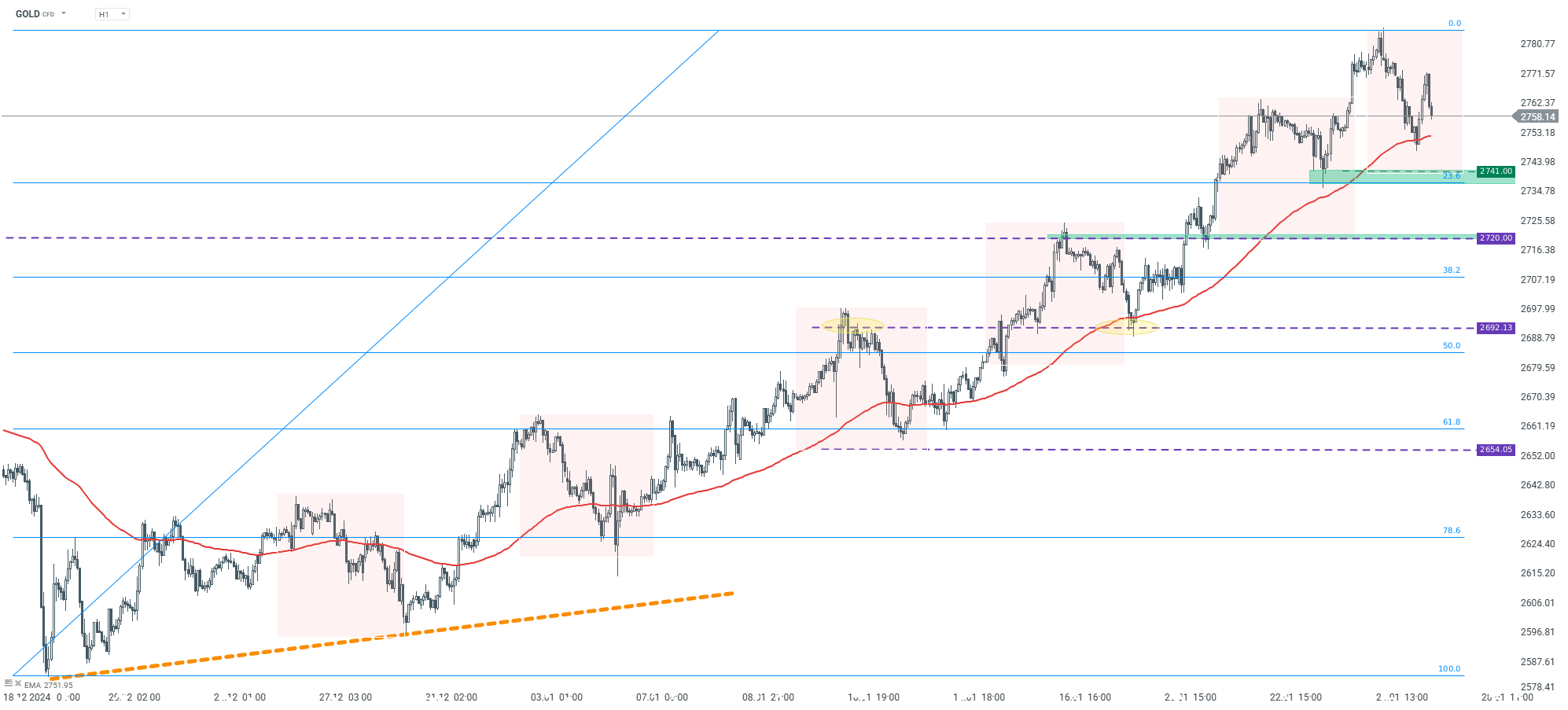 En cuanto al marco temporal inferior - H1, por otro lado, vemos una continuación de la tendencia alcista. Mientras no se rompa el patrón de corrección más grande, según la metodología Overbalance, no hay motivos para preocuparse por un cambio de tendencia. Por tanto, el soporte clave a corto plazo es la zona en el nivel de 2741 dólares. También cabe destacar la media EMA-100, que actualmente se está poniendo a prueba y que también debería considerarse como soporte.