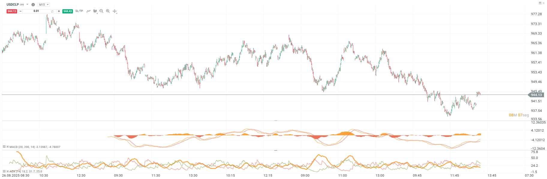 En el gráfico de 15 minutos del par USDCLP, se observa una tendencia claramente descendente. El comportamiento del precio confirma la ausencia de fuerza compradora significativa, manteniéndose por debajo de niveles relevantes.