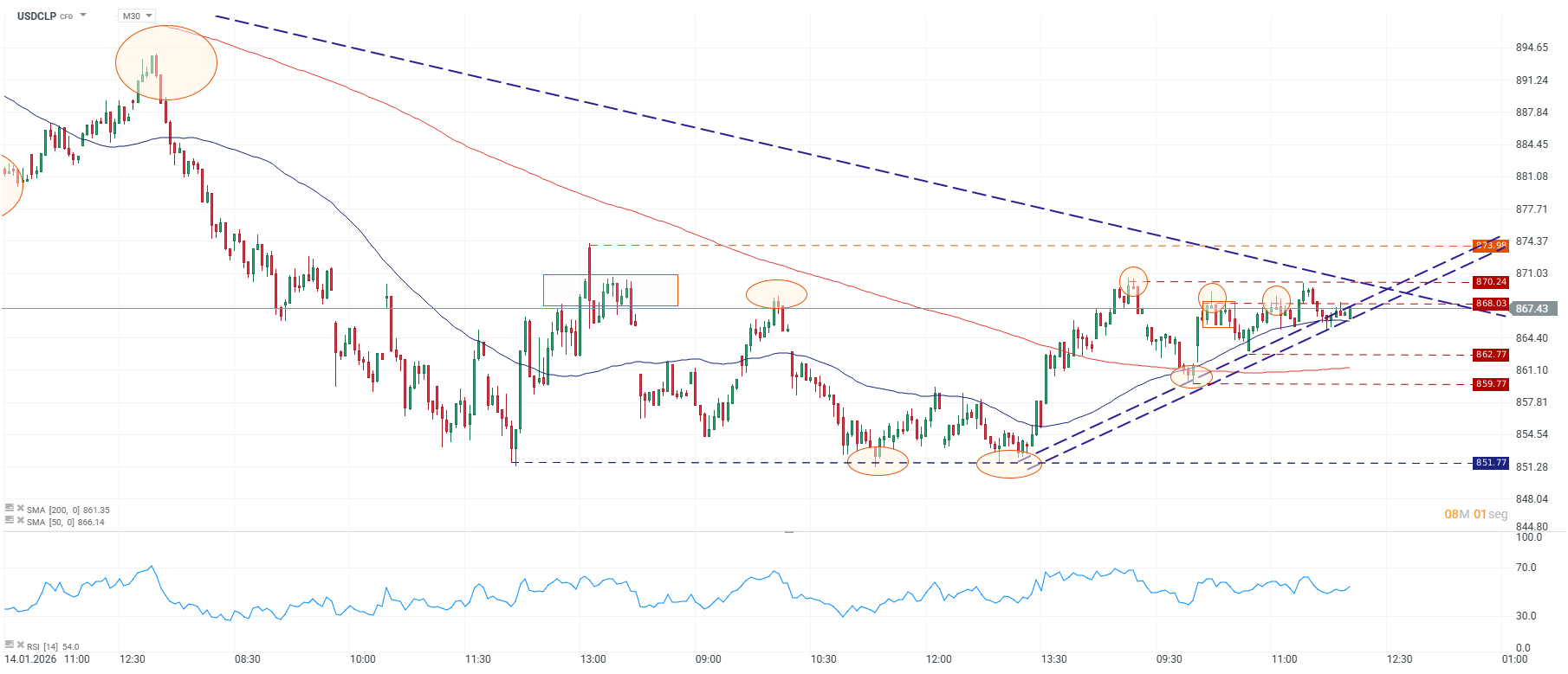 El precio se mantiene sobre las medias móviles, con la SMA 50 cruzando por encima de la SMA 200, reforzando el impulso reciente, mientras el RSI sugiere momentum neutral-alcista sin condiciones de sobrecompra. No obstante, la zona de 870–874 opera como resistencia relevante, coincidiendo con máximos previos y una directriz bajista de mayor plazo. Un quiebre sostenido sobre 873.98 habilitaría extensión hacia niveles superiores, mientras que rechazos en esta área podrían gatillar retrocesos hacia 862.77 e incluso 859.77, donde converge soporte dinámico y estático.