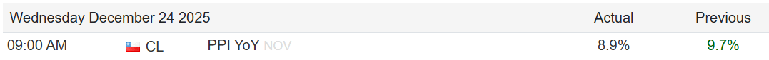 Ademas, hoy, 24 de diciembre de 2025, el INE publicó el dato del Índice de Precios de Productor (IPP) de Industrias de noviembre de 2025 y salió a la baja: -0,8% mensual, con un acumulado de 8,7% en lo que va del año (enero a noviembre). Instituto Nacional de Estadísticas