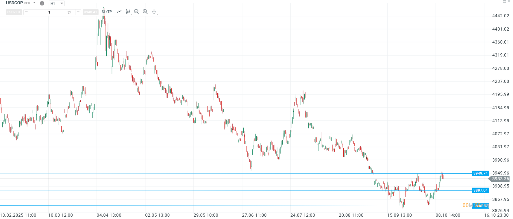 El gráfico de una hora (H1) del par USDCOP muestra una clara tendencia bajista desde mediados de mayo, con una serie de máximos y mínimos descendentes.