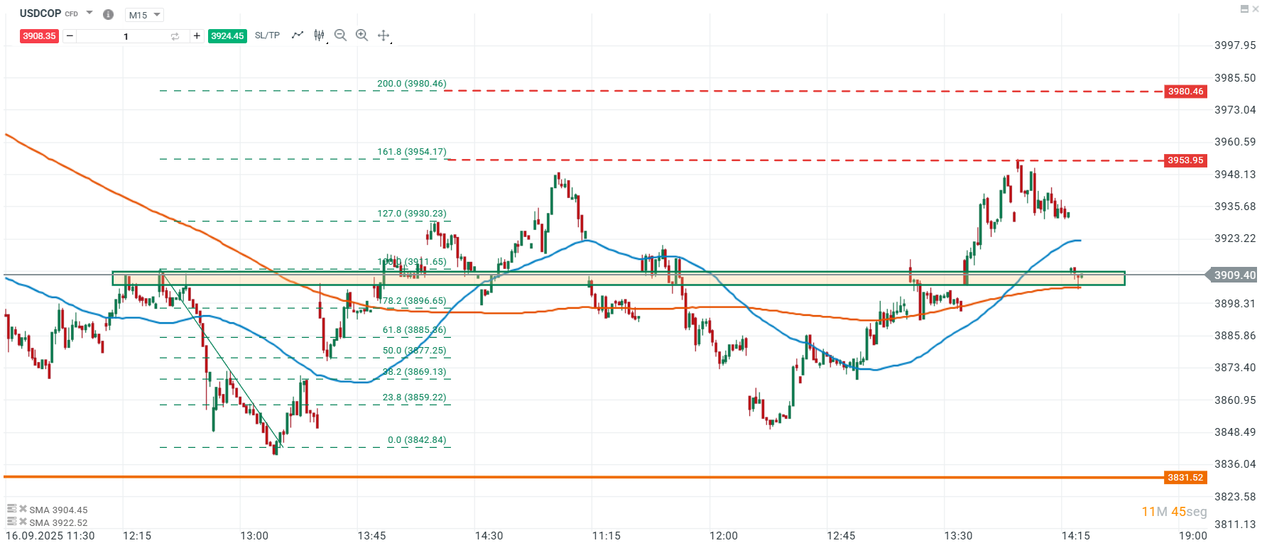 El gráfico intradía (M15) del dólar frente al peso colombiano muestra una estructura claramente acumulativa.