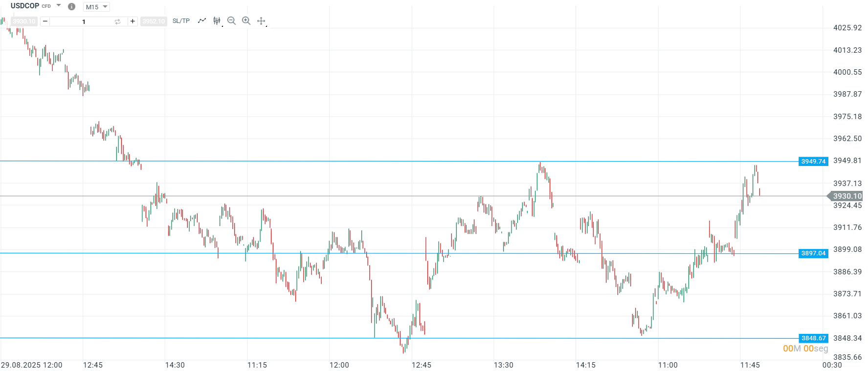 Resistencia inmediata en 3949 y soporte en 3897 COP , configurando un sesgo neutral-alcista que podría consolidarse si el tipo de cambio se mantiene por encima de 3930.