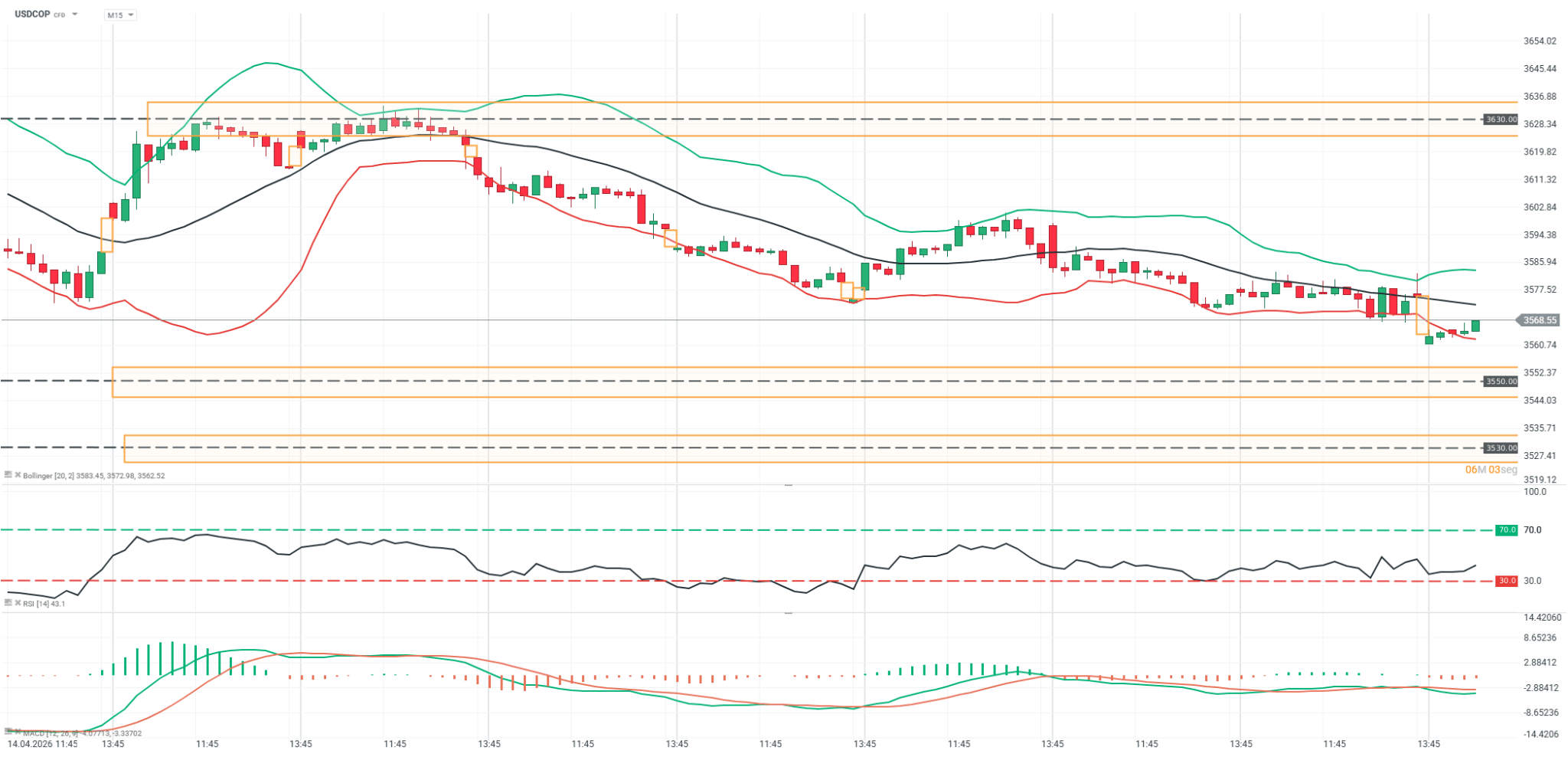 El precio de USDCOP en M15 mantiene una estructura bajista tras el rechazo en la zona de 3.630, donde las velas muestran pérdida de impulso con cuerpos pequeños y sombras superiores. A partir de ese nivel, el activo desarrolla una secuencia de máximos descendentes con retrocesos limitados, lo que refleja presión vendedora constante. La media móvil acompaña el movimiento con pendiente negativa y actúa como resistencia dinámica, mientras el precio se mantiene por debajo de ella durante la mayor parte del tramo.