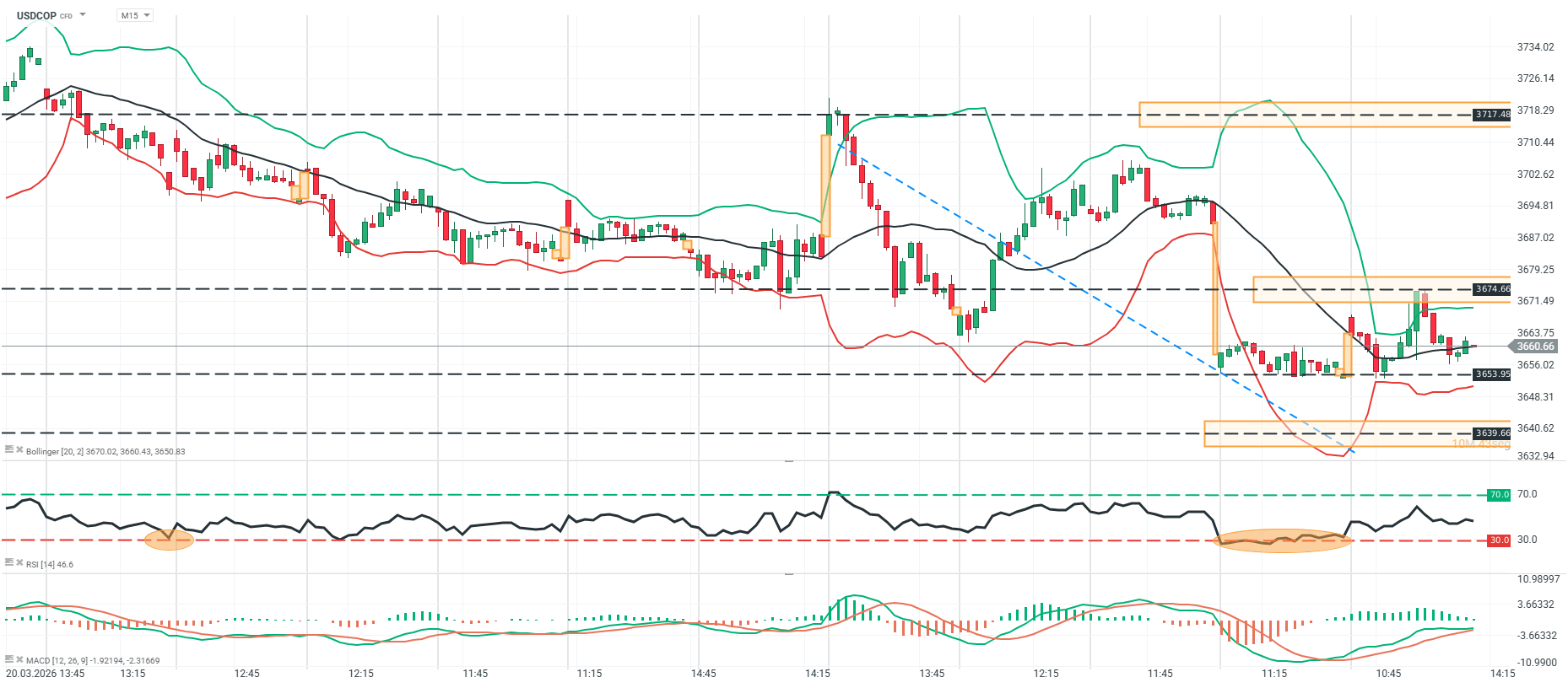 El precio del USD/COP en M15 se encuentra en una fase de compresión correctiva dentro de una estructura bajista mayor. La secuencia dominante sigue siendo de máximos descendentes desde la zona de 3,717, y eso se refleja en la pendiente todavía negativa de la media móvil central y en la incapacidad del precio para reinstalarse sobre la resistencia de 3,674.66, que es el nivel técnico más relevante del corto plazo. Al mismo tiempo, el tramo bajista más reciente perdió aceleración al acercarse a 3,653.95, nivel que coincide con soporte horizontal y con una zona donde el precio dejó de extenderse hacia la siguiente referencia en 3,639.66. Esa desaceleración también se ve en la ruptura de la directriz bajista punteada, pero el rebote posterior no ha tenido profundidad suficiente como para modificar la estructura principal, porque el precio continúa trabajando debajo de la media y lejos de la zona alta de control.