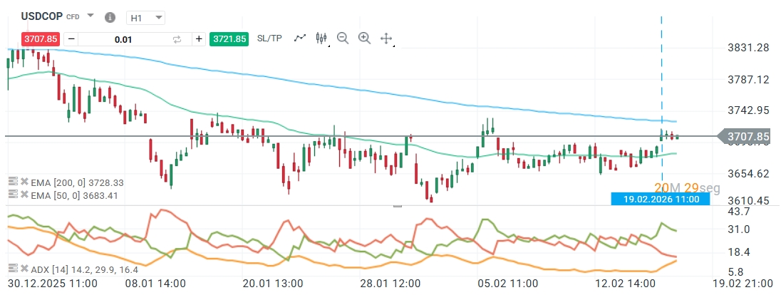 El precio del USDCOP ha logrado consolidarse por encima de la EMA de 50 periodos (ubicada en 3.683,41), nivel que ahora actúa como soporte dinámico inmediato. El salto alcista observado en las últimas horas ha llevado la cotización hasta los 3.707,85, superando la barrera psicológica de los 3.700 pesos. Este movimiento invalida la calma de sesiones previas y pone a la fuerza alcista bajo el control del impulso de corto plazo.