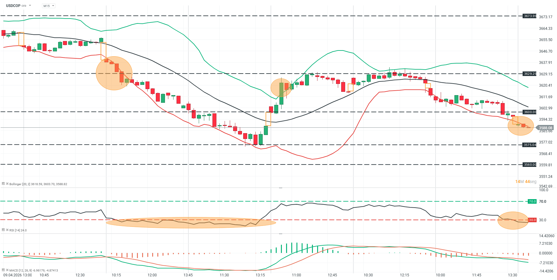 El precio del USDCOP en gráfico de 15 minutos se encuentra en una fase de distribución, operando por debajo de la media móvil central de las Bandas de Bollinger, la cual actúa ahora como resistencia dinámica tras el quiebre de la estructura alcista previa. Las zonas marcadas con círculos naranjas muestran una expansión de la volatilidad hacia la banda inferior, confirmada por un MACD que ha cruzado a territorio negativo (histogramas rojos crecientes), lo que indica un impulso bajista sólido y una pérdida total del control por parte de los compradores en el nivel psicológico de los 3600.