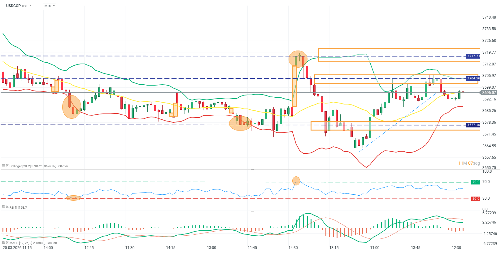 El precio del USDCOP en M15 mantiene una estructura lateral tras un impulso alcista previo, con el movimiento reciente desarrollándose dentro de un rango delimitado entre 3677 y 3704. Tras el impulso que llevó al precio hacia la zona de 3717, se observa un rechazo claro en resistencia, seguido de una corrección que encuentra soporte en la franja de 3677, donde previamente se ha generado reacción compradora. Desde ese nivel, el precio logra sostener mínimos y recuperar parcialmente, ubicándose nuevamente cerca de la media móvil, que comienza a aplanarse, reflejando pérdida de direccionalidad en el corto plazo. Las bandas de Bollinger muestran una contracción progresiva luego de la expansión previa, lo que sugiere fase de consolidación.