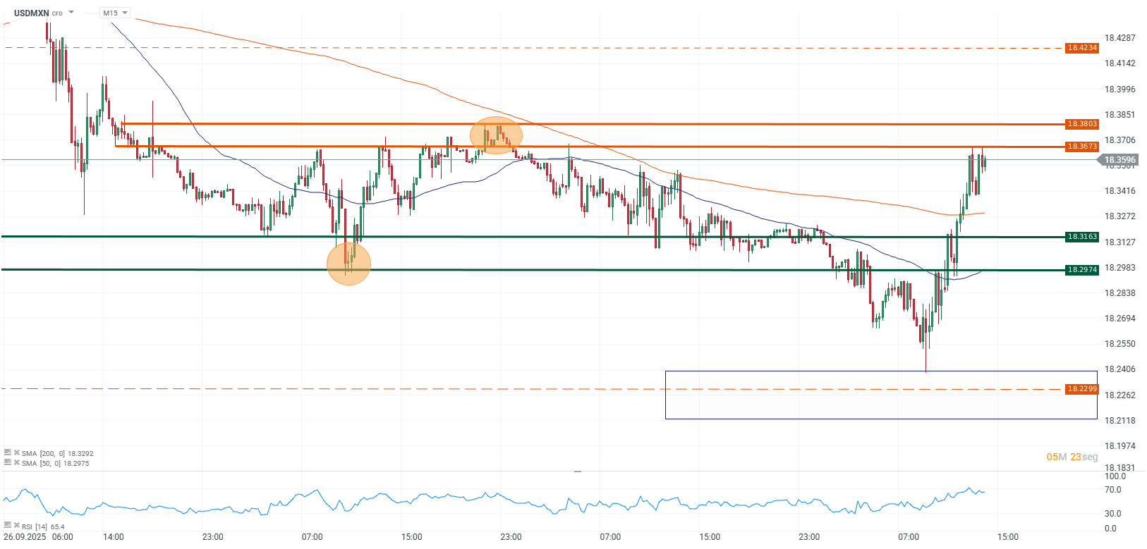 El USD/MXN rebotó con fuerza desde el soporte de 18,23, rompiendo al alza la media móvil de 200 periodos en torno a 18,33, lo que indica un sesgo alcista en el muy corto plazo. El par enfrenta ahora resistencias inmediatas en 18,36 – 18,38, cuya superación podría habilitar un movimiento hacia la zona de 18,42, máximo relevante del rango. En caso de corrección, los soportes clave se ubican en 18,29 y 18,23, con un RSI en 65 que sugiere riesgo de sobrecompra en caso de un repunte adicional sin consolidación previa. Esto abre la puerta a episodios de volatilidad, con el mercado oscilando entre la presión externa por la política monetaria estadounidense y los datos locales que siguen sin mostrar una recuperación sólida en la industria.