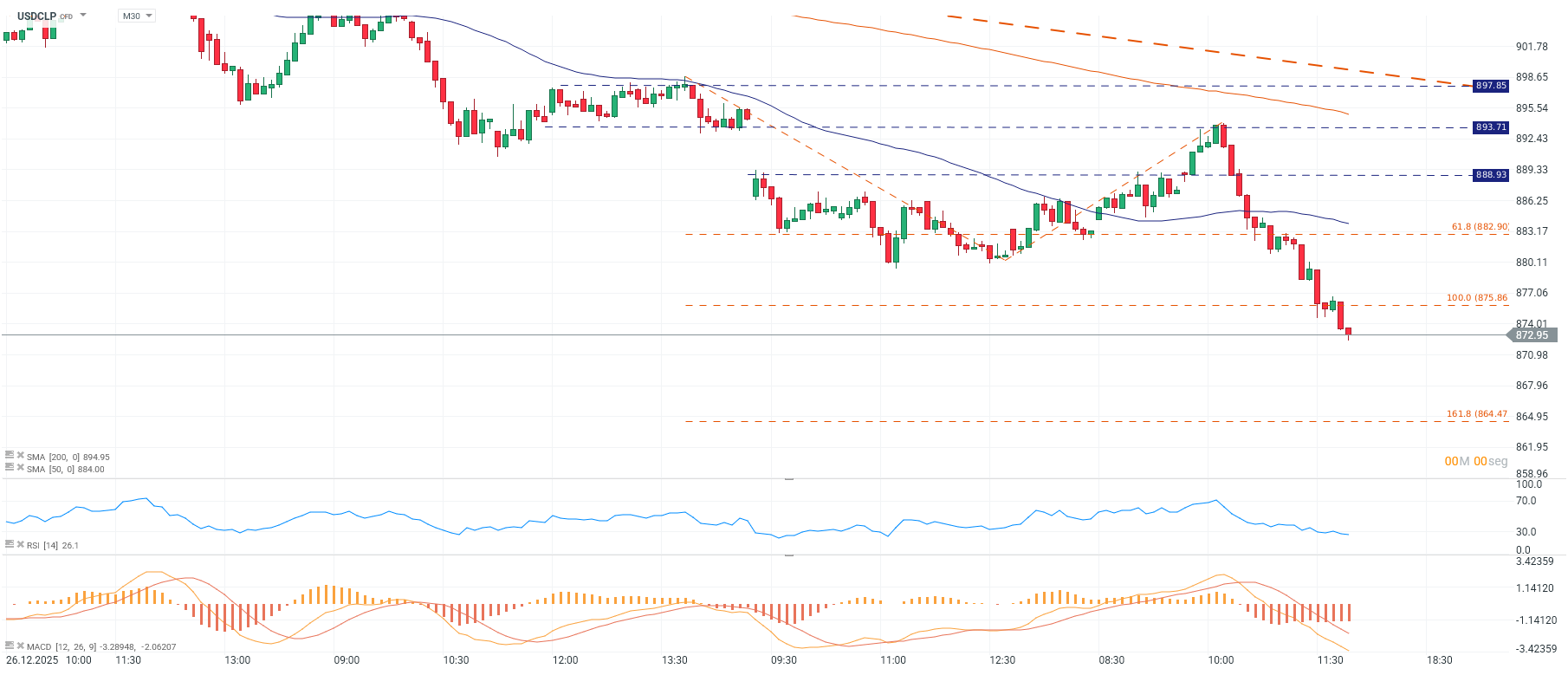 En lo técnico, el tipo de cambio profundizó el quiebre bajista, con RSI en sobreventa y soportes en 873–870, 868 y 864, y resistencias en 883, 889 y 894–898.