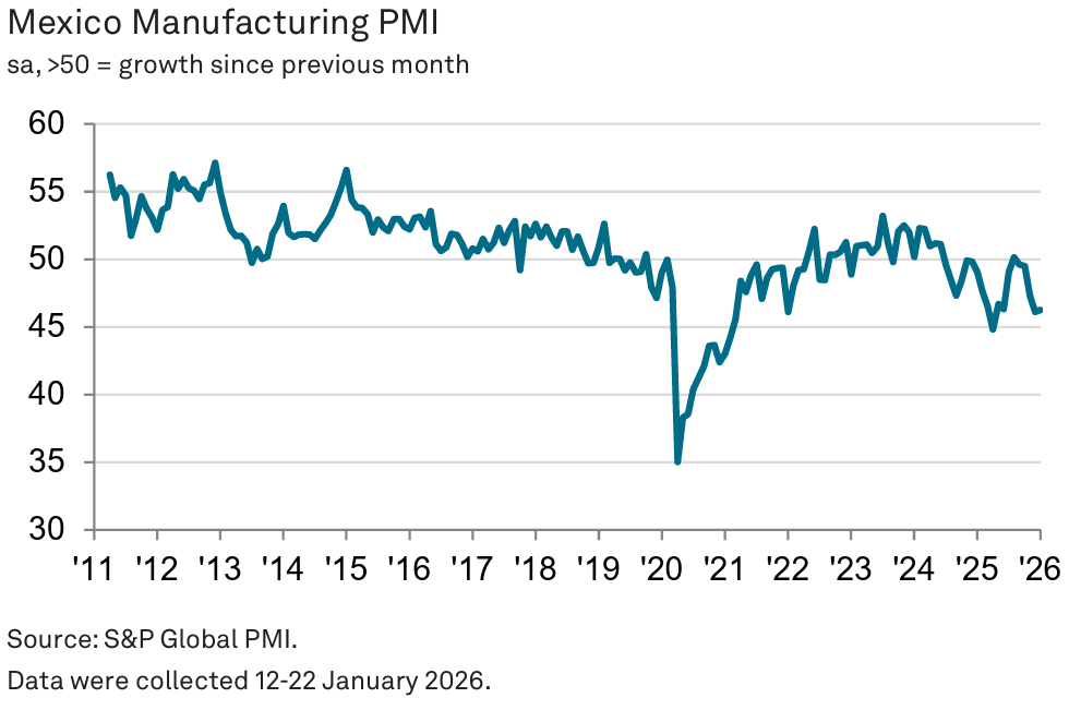 El gran “pero” para el peso mexicano es que los datos de actividad doméstica siguen mostrando debilidad. El PMI manufacturero de S&P Global subió apenas a 46,3 en enero (desde 46,1), todavía en zona de contracción y consistente con deterioro marcado de las condiciones operativas.