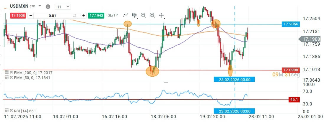 Actualmente, el cruce busca estabilizarse sobre la EMA de 50 periodos (17.1841), la cual actúa como el soporte dinámico de corto plazo más cercano. Con un RSI en los 55.1 puntos, el peso mexicano aún dispone de margen para una mayor apreciación antes de alcanzar niveles de saturación. Bajo este escenario, es probable que el par intente testear el soporte histórico de los 17.0998, zona donde se identifica un patrón de doble piso y una falsa rotura previa el 18 de febrero.