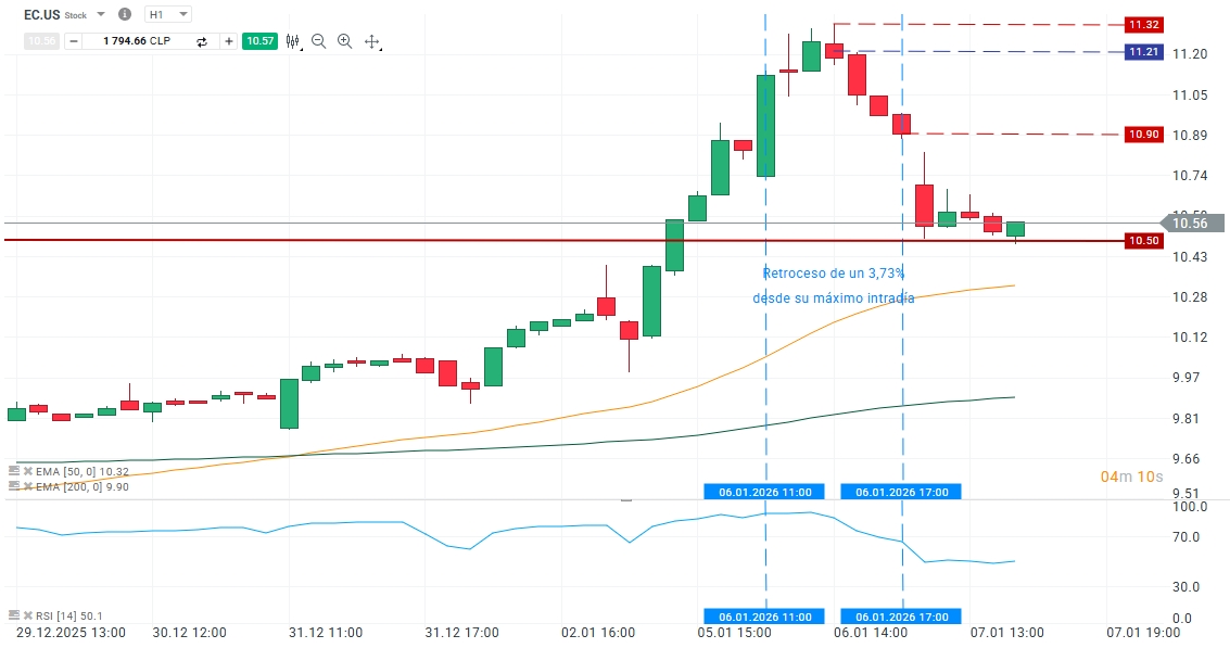 En el corto plazo, EC.US se encuentra negociando en torno a USD 10,50, con un impulso de movimiento medio (49,2). El precio viene corrigiendo desde el nivel clave de USD 10,90, acumulando una caída cercana a -3,22% desde ese punto, lo que convierte a 10,90 en resistencia inmediata y zona a recuperar para revalidar fuerza compradora.