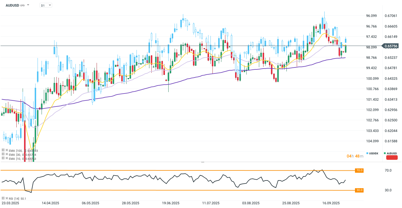 El AUD/USD ha mantenido una clara tendencia alcista desde abril, impulsado principalmente por la depreciación general del dólar estadounidense (índice USD invertido en azul). Tras oscilaciones notables en septiembre, el par ha registrado solo un 0,5 % de alza en lo que va del mes. No obstante, una postura más restrictiva por parte del RBA, combinada con las agresivas expectativas de relajación en EE. UU., debería contribuir a mantener esta tendencia en los próximos meses.